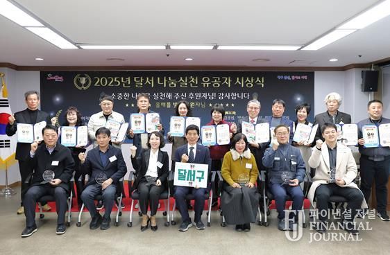 파이낸셜 저널 금교광 기자 | 대구 달서구는 지난 26일 달서구청에서 지역의 어려운 이웃을 위해 꾸준한 나눔을 실천해 온 기업·단체 및 개인 유공자들에게 감사의 뜻을 전하는 ‘2025년 나눔실천 유공자 시상식’을 개최했다.