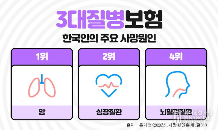 파이낸셜 저널 강대산 기자 | 한국인의 주요 사망원인중에 암, 뇌혈관질환, 심혈관질환은 흔히 3대질병이라 일컬어지며 살아가면서 가장 먼저 대비해야 하는 중대질병으로 항상 강조되고 있다. 이들 질병에 미리 대비하기 위해 가입하는 것이 진단비보험인데, 이러한 3대질병진단비를 중점으로 보장하는 보장성보험이 3대진단비보험 이다. 3대질병진단비보험은 각각의 질병에 주목해서 보장하기도 하지만, 나에게 맞는 추가 특약을 잘 골라서 가입한다면 종합건강보험으로도 충분히 활용도가 높다.