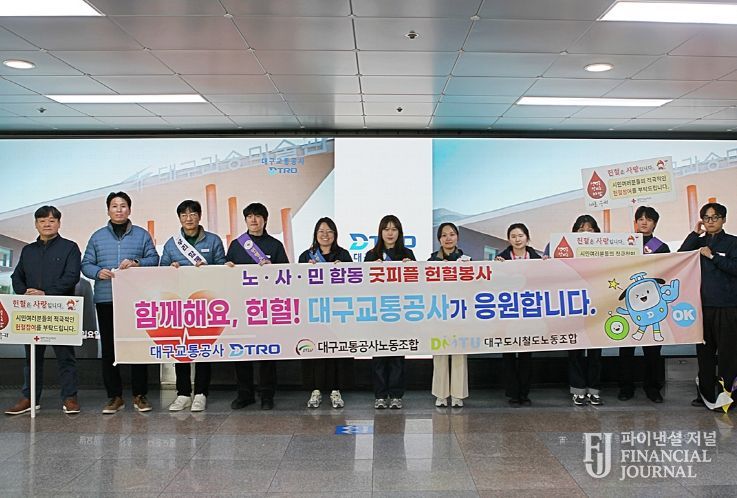 파이낸셜 저널 금교광 기자 | 대구교통공사는 지난 11월 27일 상인동 본사와 월배·문양·칠곡경전철 차량기지 등 총 4개 사업장에서 ‘노·사·민이 함께하는 생명 나눔 헌혈행사 및 헌혈 참여 캠페인’을 진행했다.