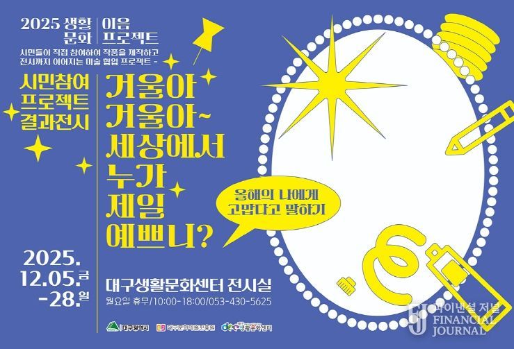 파이낸셜 저널 금교광 기자 | 대구문화예술진흥원 대구생활문화센터는 ‘2025 생활문화 이음 프로젝트’ 결과 전시 ‘거울아, 거울아~ 세상에서 누가 제일 예쁘니?’를 12월 5일부터 28일까지 대구생활문화센터 1층 전시실에서 개최한다.