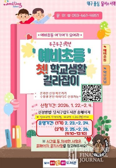 파이낸셜 저널 금교광 기자 | 대구 달서구는 2026년 초등학교 입학을 앞둔 예비 학부모와 예비 초등학생을 대상으로, 입학 준비와 교육과정 안내, 자녀의 바른 성장과 발달을 돕기 위한 ‘예비초등! 첫 학교생활 길라잡이’를 달서구청과 달서어린이도서관에서 개최한다.