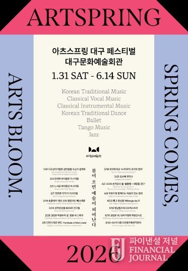 파이낸셜 저널 금교광 기자 | 대구문화예술회관은 대구를 기반으로 활동하는 지역 예술인들의 공연을 한데 모아 그들의 예술혼을 집중 조명하는 축제 '2026 아츠스프링 대구 페스티벌'의 16개 공연을 오는 1월 31일부터 6월 14일까지 대구문화예술회관에서 개최한다고 밝혔다.