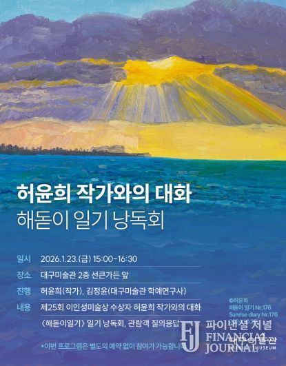 파이낸셜 저널 금교광 기자 | 대구문화예술진흥원 대구미술관은 제25회 이인성미술상 수상자전 ‘허윤희: 가득찬 빔’의 전시 연계 프로그램으로 ‘허윤희 작가와의 대화: 해돋이 일기 낭독회’를 1월 23일 오후 3시, 대구미술관 2층 선큰가든에서 개최한다.