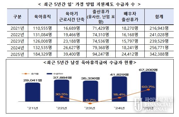 2025년 남성 육아휴직급여 수급자 수는 6만 7,200명으로 전체 수급자의 36.5%를 차지했다. 이는 전년 대비 60.7% 증가한 수치로 여성 증가율(29.1%)을 크게 웃돌았다. 육아휴직, 육아기 근로시간 단축, 출산휴가 등 일·가정 양립 지원제도 수급자 수는 34만 2,388명으로 집계됐다. 관련 통계 작성 이후 처음으로 30만 명을 넘어선 것으로 전년 대비 33.3% 증가해 최근 5년 중 가장 높은 증가율을 기록했다.