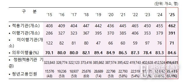 2025년 공공기관 청년고용의무 이행결과에 따르면, 적용기관 462개소의 84.6%(391개소)가 청년고용의무를 이행한 것으로 조사되어 2024년(83.3%, 379개소) 대비 1.3%p(+12개소) 증가했다.