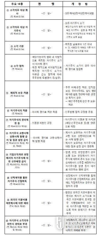 또한, 개정안은 모든 자기주식의 소각을 ‘이사회 결의’로 하도록 하여 소각 절차를 간소화했고, 법령상 외국인 지분비율이 제한되는 회사가 소각으로 외국인 지분비율이 초과될 경우 시행일로부터 3년 이내 자기주식을 처분할 수 있도록 하여 유예기간을 추가로 부여했다.