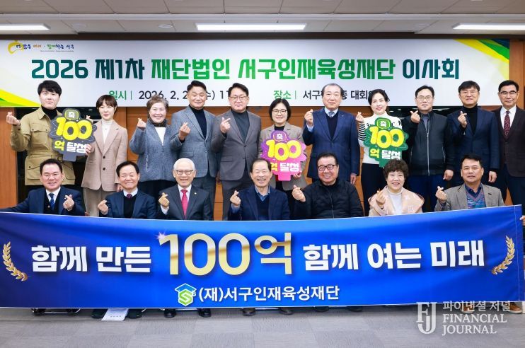 파이낸셜 저널 금교광 기자 | 재단법인 서구인재육성재단은 2026년 2월 25일 오전 11시 서구청 3층 대회의실에서 ‘2026년 제1차 이사회’를 개최하고 기본재산 100억 원 달성을 축하하는 기념 촬영을 진행했다.