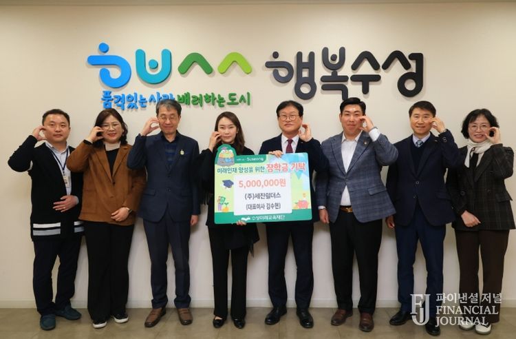 파이낸셜 저널 금교광 기자 | ㈜세진쉴더스(대표이사 김수현)는 지난 26일 미래인재 육성과 지역 교육 발전을 위해 장학금 500만 원을 수성미래교육재단에 전달했다.
