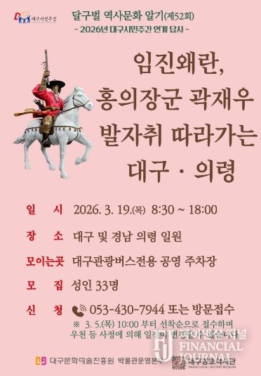 파이낸셜 저널 금교광 기자 | 대구문화예술진흥원 박물관운영본부 소속 대구향토역사관은 2026년 대구시민주간 연계 프로그램으로 3월 19일에 ‘임진왜란, 홍의장군 곽재우 발자취 따라가는 대구·의령’ 답사를 개최한다.