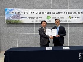 파이낸셜 저널 강대산 기자 | 대한민국 에너지 대전환의 핵심 거점이 될 전남 해남군 산이면 일대에 국내 최대 규모의 재생에너지 복합단지가 들어선다. 이는 이재명 정부가 국정 핵심 과제로 추진 중인 ‘에너지 고속도로’ 구축과 ‘지방 시대 에너지 기본소득’ 정책을 실현하는 선도 모델이 될 것으로 기대를 모으고 있다. 파라솔라코(주)(대표 고창열)와 (주)드림엔지니어링(대표 오진택)은 2026년 1월 6일 오후 4시, 드림엔지니어링 본사 회의실에서 ‘해남군 산이면 태양광발전소 개발허가 및 솔라시도 타운 조성 협약식’을 개최했다고 밝혔다. 이번 협약은 해남군 산이면 부동리, 대진리, 상공리 일원 약 500만 평(1차 부지)에 달하는 부지를 신재생에너지 자립 도시로 탈바꿈시키는 ‘솔라시도 타운 프로젝트’의 성공적인 추진을 목적으로 한다. 이 프로젝트는 정부의 ‘2026 에너지 대전환 로드맵’에 따라 크게 세 가지 핵심 축을 중심으로 진행된다. 첫째, 대규모 태양광 발전단지 발전용량은 전체 1,000MW(1차 300MW, 2차 300MW, 3차 400MW)로 추진될 계획이며, 에너지 고속도로 연계를 통한 에너