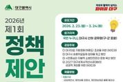 파이낸셜 저널 금교광 기자 | 대구광역시는 전 국민과 시 산하 공무원의 창의적인 정책 아이디어를 발굴해 시정 발전의 동력으로 활용하고자 ‘2026년 제1회 정책제안 공모’를 개최한다. 이번 공모는 총 4개 분야를 주제로 진행된다. ▲대구 대표 지방정원(하중도) 조성을 위한 아이디어 ▲ 대구시 승용차요일제 참여율 제고 방안 ▲시민 중심의 자발적 소방안전관리 문화 확산 방안 ▲2027 대구세계사격선수권대회의 성공 개최 방안이다. 공모 기간은 2월 23일부터 3월 24일까지 30일간이며, 대한민국 국민이라면 누구나 참여할 수 있다. 제안은 대구시 온라인 참여 플랫폼 ‘토크대구’, 국민신문고, 우편, 방문, 팩스 등을 통해 접수 가능하며, 자세한 사항은 대구시청 홈페이지 공고 게시판에서 확인하면 된다. 접수된 제안은 업무 담당부서에서 창의성과 실시 가능성 등을 기준으로 채택 여부를 사전 검토하고, 이후 제안실무위원회 심의를 거쳐 우수 제안 후보를 선정한다. 선정된 후보에 대해서는 5월 초 시민이 직접 참여하는 온라인 투표 점수(30%)와 전문가로 구성된 제안심사위원회 심사 점수(70%)를 합