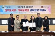 파이낸셜 저널 금교광 기자 | 대구문학관과 대구도서관은 지난 1월 30일 독서문화 진흥과 지역문화 활성화를 위한 업무협약을 체결했다. 대구도서관에서 열린 이번 협약식에는 하청호 대구문학관 관장과 권현주 대구도서관 관장 외 각 기관의 실무자들이 참석하여, 두 기관의 상호협력 방안을 공유하며 지역 문학 및 문화예술의 가치 확산을 위한 활동을 공동으로 추진하는 데 뜻을 모았다. 양 기관은 이번 업무협약을 시작으로 앞으로 독서문화 진흥을 위한 사업 발굴 및 추진, 독서문화 프로그램 운영을 위한 전문 강사 및 인력 지원, 전시 및 문학 프로그램 운영 협업 활동을 함께 적극적으로 펼쳐 나갈 계획이다. 양 기관의 대표는 “지역에서 독서 및 문학향유의 중심에 선 두 기관 간의 이번 업무협약을 계기로 앞으로 양질의 창의적인 프로그램 개발을 통해 서로 간의 인적, 물적 교류가 활발하게 이루어져 지역의 독서문화를 선도해 갈 수 있기를 희망한다.”고 이번 업무협약에 대한 기대를 밝혔다.