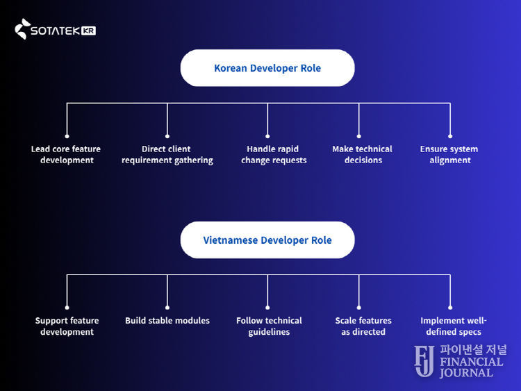 최근 국내 IT 업계에서는 한국 개발자와 베트남 개발자 간의 역할 분담이 더욱 명확해지는 추세다. 한국 개발자들은 핵심 기능 개발을 주도하며, 고객사로부터 요구사항을 직접 수집해 신속하게 대응하는 역할을 맡고 있다. 또한 기술적 의사결정을 수행하고 시스템의 전체적인 방향성을 관리하는 등 프로젝트의 전략적 중심축을 담당한다.