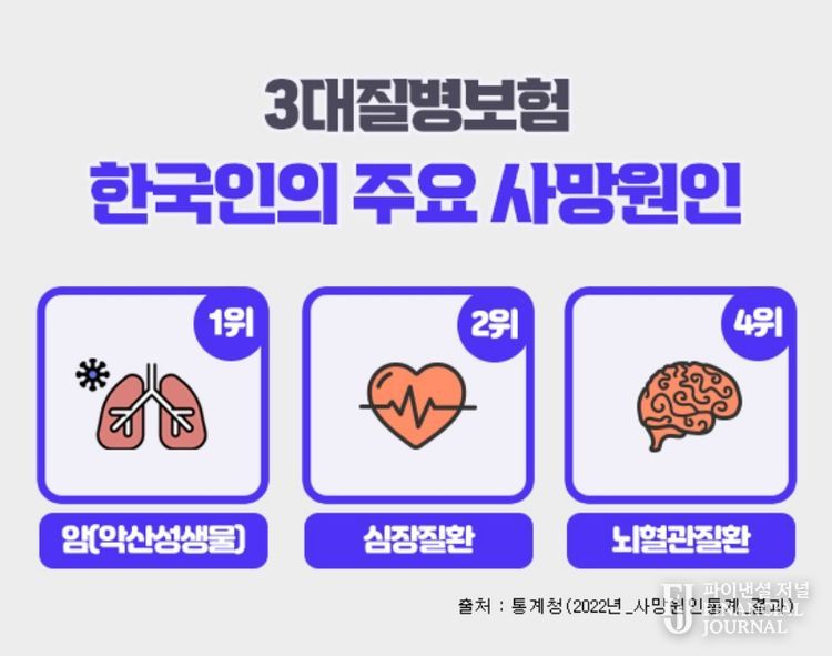 파이낸셜 저널 강대산 기자 | 흔히 3대질병이라 일컫는 암, 심혈관질환, 뇌혈관질환은 통계청 발표자료에 따르면 한국인의 주요 사망원인 중에서 3위 폐렴을 제외하고 1~4위를 차지하고 있으며, 이전부터 지금까지도 살면서 가장 먼저 대비해야 하는 치명적인 질병으로 강조되고 있다. 이러한 중대질병에 대비하기 위하여 상기 세가지 치명적인 질병을 집중보장하는 3대질병진단비보험을 많이 가입하고 있다. 3대진단비보험은 각각의 질병을 중점적으로 보장하면서도 가입자 특성에 맞는 특약을 추가함으로써 종합건강보험으로도 활용할 수가 있다.