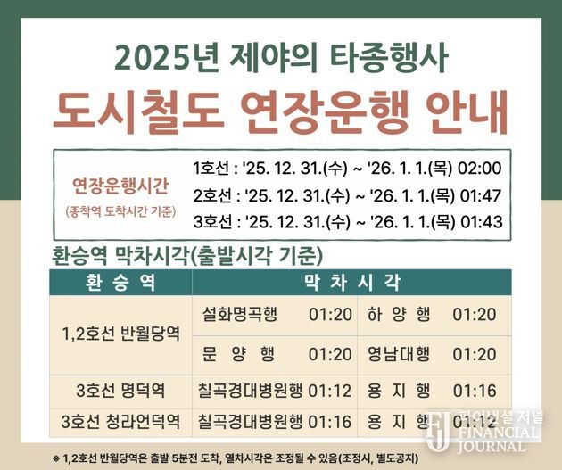 한편, 행사 당일 밤 10시 30분부터 다음날 01시 30까지 동인네거리~삼덕네거리, 공평네거리~동신교 서편 구간이 전면 통제된다. 행사장 인근을 통과하는 시내버스 18개 노선*은 밤 10시 30분 이후 행사장을 우회 운행하고, 직행 1개 노선과 급행 4개 노선**은 새벽 1시경 시내를 통과한다. 도시철도는 반월당역과 명덕역을 다음날 01시 10분경 통과하도록 연장 운행해 시민들의 안전한 귀가를 도울 계획이다.
