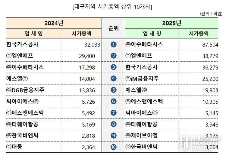 대구지역 상장기업 시가총액 상위 10개사의 순위가 2024년과 2025년 사이 크게 바뀌었다.