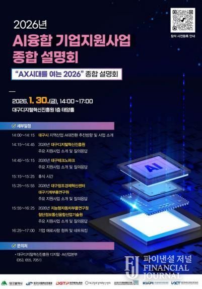 파이낸셜 저널 금교광 기자 | 대구광역시는 1월 30일 오후 2시, 대구디지털혁신진흥원(DIP) 1층 태양홀에서 지역 AI융합 기업지원기관 7개 기관이 공동으로 ‘2026년 AI융합 기업지원사업 종합설명회’를 개최한다.
