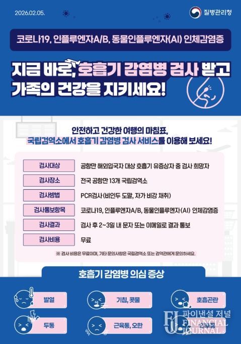파이낸셜 저널 강대산 기자 | 질병관리청은 2026년 2월 10일부터 '여행자 호흡기 감염병 검사 서비스'를 전국 공항·항만 13개 검역소(12개 지소)로 확대하여 시행한다.