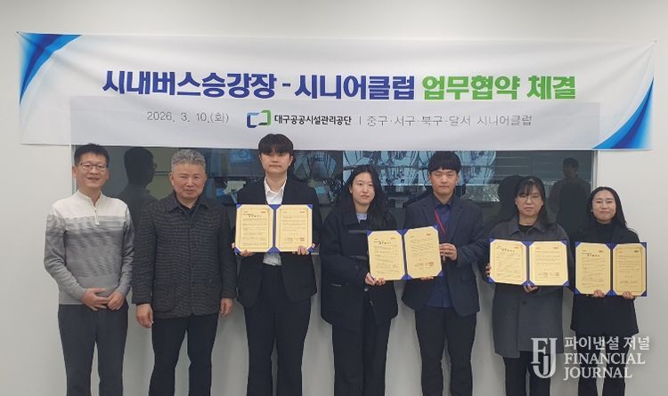 파이낸셜 저널 금교광 기자 | 대구공공시설관리공단(이사장 문기봉) 시내버스유개승강장은 지난 3월 10일(화), 시내버스유개승강장 사무실에서 지역 4개 시니어클럽과 업무협약을 체결했다.