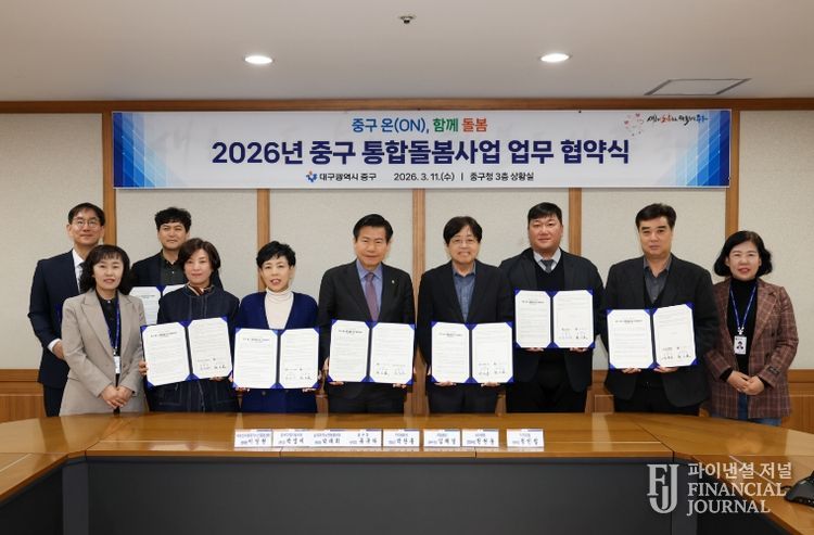 파이낸셜 저널 금교광 기자 | 대구 중구는 지난 11일 구청 상황실에서 ‘중구 온(ON), 함께 돌봄’ 통합돌봄 지역특화사업의 안정적 추진을 위해 관내 7개 기관과 업무협약을 체결하고, 민·관 협력 기반의 지역 통합 돌봄 체계 구축에 나섰다.
