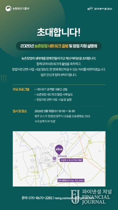 파이낸셜 저널 강대산 기자 | 농림축산식품부는 3월 18일 농촌 활력 증진과 농촌 자원을 활용한 창업을 지원하기 위한 '농촌창업 네트워크'를 공식 출범하고, 농촌창업 관련 지원사업 정보를 종합적으로 안내하는 설명회를 개최한다고 밝혔다.
