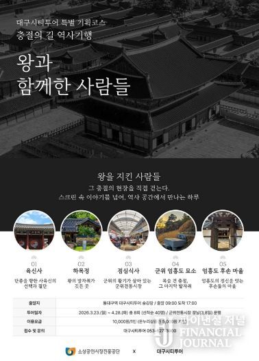 파이낸셜 저널 금교광 기자 | 대구광역시는 시범 운영 당시 접수 시간 1시간 만에 조기 마감되며 큰 호응을 얻은 대구시티투어 특별코스 ‘충절의 길, 역사기행-왕과 함께한 사람들’을 3월 23일부터 4월 28일까지 8회 추가 운영한다.
