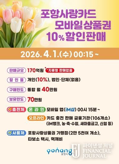 파이낸셜 저널 금교광 기자 | 포항시가 지역 경제에 활력을 불어넣기 위해 내달 1일부터 카드형·모바일 포항사랑상품권(포항사랑카드) 170억 원을 10% 할인된 금액으로 판매한다.