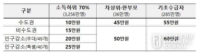 소득 하위 70% 국민에게 거주 지역별로 수도권 10만원, 비수도권 15만원, 인구감소 우대지역 20만원, 인구감소 특별지역 25만원을 지급할 예정이며, 한부모가족・차상위계층은 45만원, 기초생활수급자는 55만원을 지급하되 비수도권에 거주하는 경우에는 1인당 5만원을 추가 지급한다.