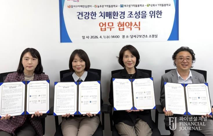 파이낸셜 저널 금교광 기자 | 대구 달서구는 지난 1일 늘푸른기억돌봄학교, 대구샘기억돌봄학교, 상록수기억돌봄학교와 업무협약을 체결하고, 인지저하 및 경증치매 어르신을 위한 통합돌봄 체계 구축에 나선다.