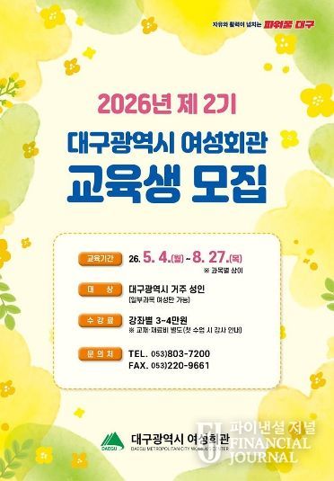 파이낸셜 저널 금교광 기자 | 대구광역시 여성회관은 시민들의 자기계발을 돕고 평생학습 기회를 확대하기 위해 4월 6일부터 ‘2026년 제2기 교육생’을 모집한다.