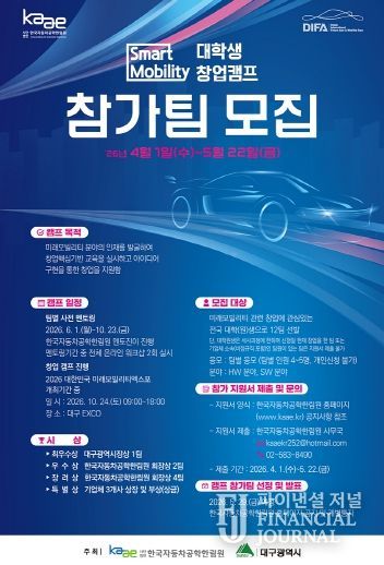 파이낸셜 저널 금교광 기자 | 대구광역시는 자동차 산업 원로들의 풍부한 현장 경험과 청년들의 혁신적인 아이디어를 결합해 미래모빌리티 핵심 인재를 육성하는 ‘2026 스마트 모빌리티 창업캠프’ 참가팀을 모집한다.