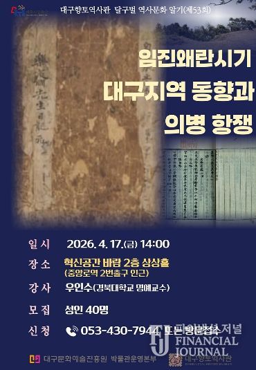 파이낸셜 저널 금교광 기자 | 대구문화예술진흥원 박물관운영본부 소속 대구향토역사관은 2026년 대구시민주간 연계 프로그램으로 ‘임진왜란시기 대구지역 동향과 의병 항쟁’을 주제로 4월 17일 2시에 전문가 특강을 개최한다.