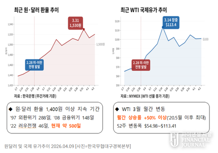 원·달러 환율은 장중 1530원을 돌파하며 17년 만의 최고치를 기록했고, 미-이란 전쟁 여파로 국제유가가 배럴당 113달러를 넘어서는 등 유례없는 거시경제적 압박이 지속되는 중이다.