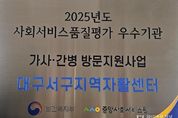 파이낸셜 저널 금교광 기자 | 대구 서구지역자활센터는 보건복지부 주관 2025년 가사·간병 방문지원사업 품질 평가에서 전국 349개소 중 상위 9개소에 해당하는‘우수 기관’으로 선정됐다. 이번 평가는 ▲기관 운영 ▲제공 인력 및 인적자원관리 ▲서비스 제공 및 평가 ▲서비스 성과 ▲현장 평가단 등 5개 영역에서 실시됐으며, 서구지역자활센터는 전 영역에서 90점 이상의 높은 점수를 획득하며 탁월한 운영 역량을 입증했다. 우수 기관으로 선정된 서구지역자활센터는 포상금과 함께 보건복지부 장관 상장, 우수 기관 현판을 수여받는 영예를 안았다. 이는 지역사회 내 돌봄서비스의 질적 향상과 지속 가능한 가사간병방문지원사업 운영에 큰 동력을 제공할 것으로 기대된다. 류한국 서구청장은 “앞으로도 가사·간병 방문 지원 서비스 대상자에게 질 높은 서비스를 제공하고, 제공 인력인 요양보호사들에게 건강하고 내실 있는 일자리를 제공할 수 있도록 서구지역자활센터를 지속적으로 지원하겠다.”라고 밝혔다.
