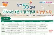 파이낸셜 저널 금교광 기자 | 대구 달서구는 12월 15일부터 24일까지 ‘2026년 1분기 달서50플러스센터 정규강좌’ 수강생을 선착순 모집한다. 달서50플러스센터는 50~64세 세대의 역량 강화와 자기계발을 지원하기 위한 평생교육 기관으로, 매 분기 다양한 교육 프로그램을 운영하고 있다. 이번 1분기에는 ▲자격증 ▲디지털 ▲어학 ▲음악·미술 ▲기획특강 등 9개 분야 총 28개 강좌가 개설된다. 교육은 2026년 1월 12일부터 3월 30일까지 강좌별 10주 과정으로 진행되며, 수강생들의 관심과 요구를 반영해 디지털·어학 분야와 직장인을 위한 야간 강좌가 확대 운영될 예정이다. 신청 대상은 주민등록상 달서구에 거주하는 50~64세 주민(50플러스세대)이며, 수강료는 전 과정 무료다. 수강 신청은 인터넷 접수 또는 전화 접수로 가능하며, 자세한 내용은 구청 홈페이지 통합예약 시스템 또는 달서50플러스센터를 통해 확인할 수 있다. 이태훈 달서구청장은 “이번 교육 프로그램을 통해 지역의 50플러스세대가 더욱 건강하고 즐겁게, 자기 주도적인 삶을 살아가는 데 도움이 되기를 바란