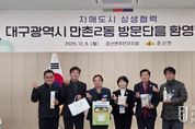 파이낸셜 저널 금교광 기자 | 대구 수성구 만촌2동 주민자치위원회는 지난 8일 자매도시인 의성군 춘산면을 방문해 양 지역 간 우호 협력 강화를 위한 교류 활동을 진행했다. 이번 방문은 2023년부터 이어온 양 지역의 자매결연을 기반으로 주민자치 중심의 상생협력을 확대하기 위해 마련된 것으로, 주민자치위원과 12개 협력 단체 회원 등 30여 명이 참석했다. 방문단은 지난달 개소한 춘산어울림공간에서 공식 환영 행사와 시설 관람을 진행하며 교류의 의미를 나눴고, 향후 협력 확대 방안도 함께 논의했다. 또한 양 지역의 특색을 담은 기념품 교환도 이뤄졌다. 만촌2동은 수성구 대표 캐릭터 ‘뚜비’ 인형과 지역 전통주 ‘느지골 오양주’를 전달했으며, 춘산면은 목재문화체험장에서 제작한 냄비 받침과 금성농협 압맥을 선물하며 따뜻한 환대의 뜻을 전했다. 박영환 주민자치위원장은 “2023년부터 이어온 두 지역의 인연이 해를 거듭할수록 더욱 깊어지고 있어 뜻깊다”며 “앞으로도 주민 중심의 실질적 상생협력이 지속될 수 있도록 적극적인 교류 활동을 이어가겠다”고 말했다. 만촌2동과 춘산면은 앞으로